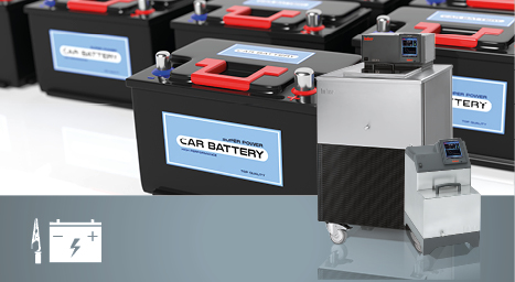 One use of lithium ion batteries is in electric vehicles. These must pass a range of temperature tests before installation. For this, an ambient temperature from -20  °C to +40 °C is created in an environmental chamber. A Unistat, which can control temperature from -40 °C to +100 °C, is connected at a test point inside the environmental chamber using hoses.